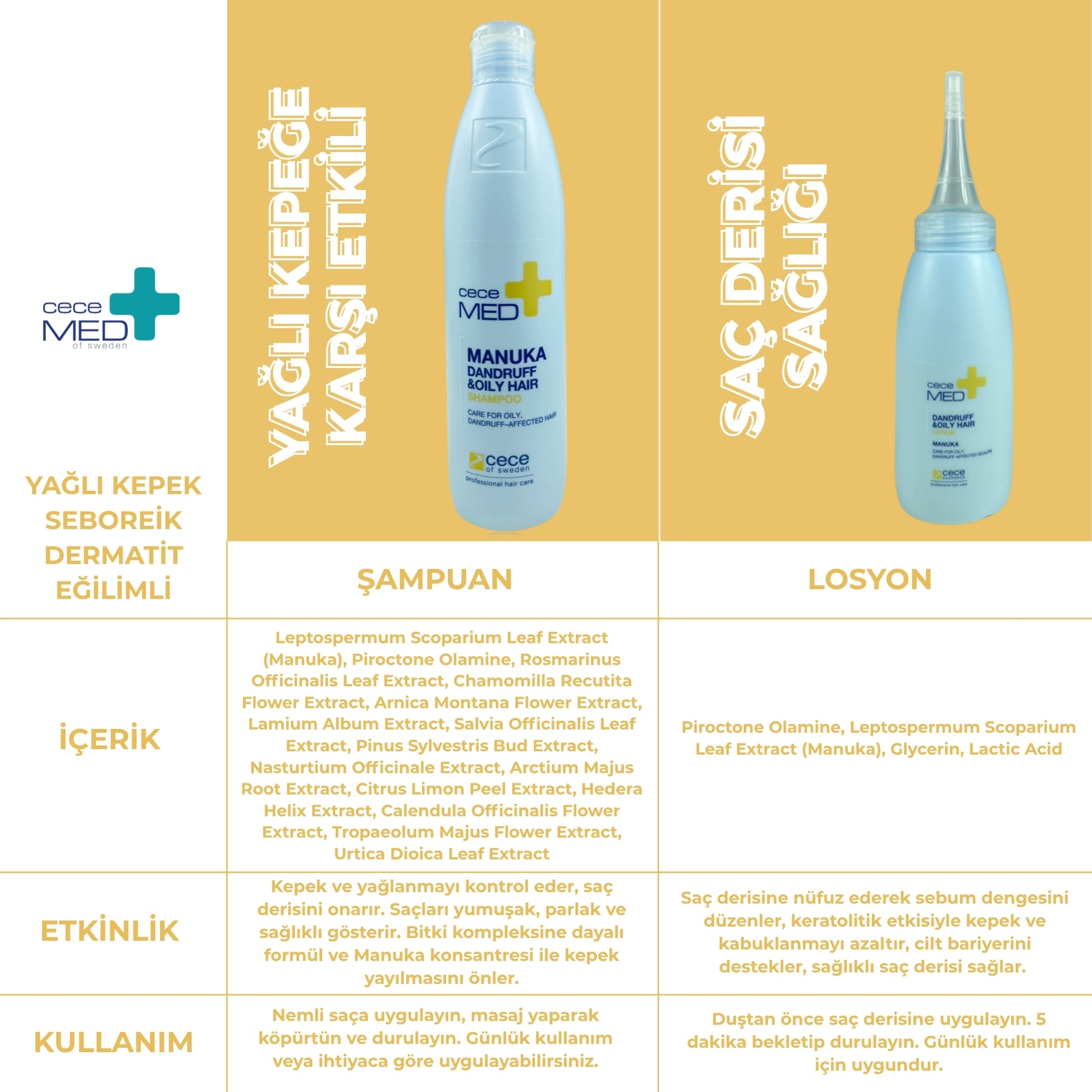 Kullanım: Manuka Dandruff losyon banyo öncesinde saçlı deriye uygulanır 5 dakika bekletilir sonrasında Manuka Dandruff şampuan ile yıkanır.